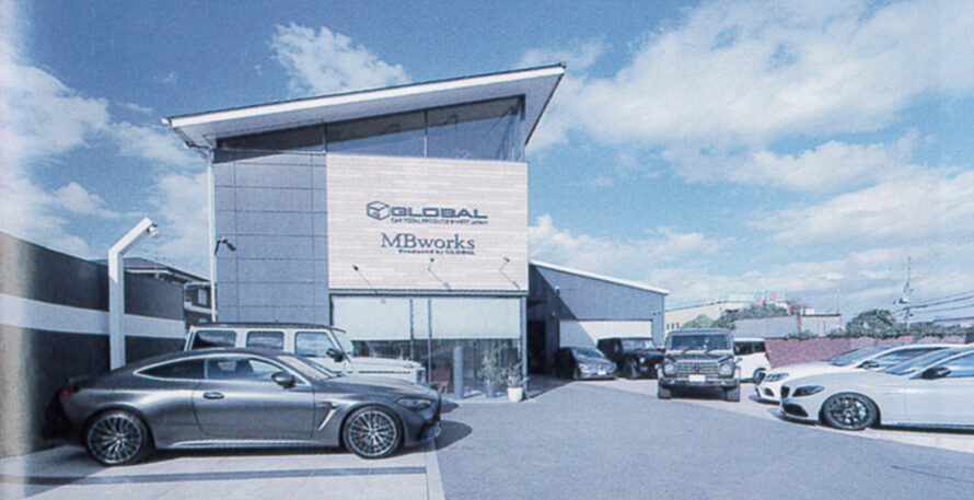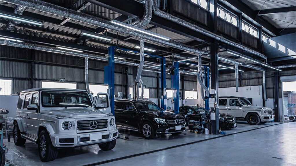クリーンなファクトリーの前には多数のメルセデスが並ぶが、車両販売が軸ではない、整備工場&カスタムショップだ。顧客との付き合いのなかで販売&買取を実施する例はある。