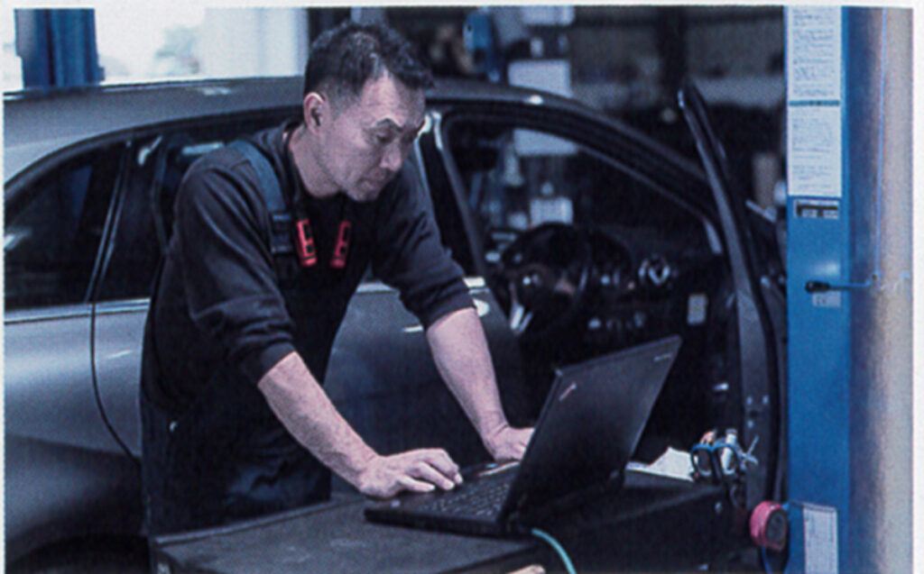 代表・西村氏のほかに2名のメカニック&エンジニアが軸となって整備、修理、そしてカスタムと向き合う。カスタム&部品交換した際にECUデータを適正に書き換えるコーディング、電子制御装置を校正・調整するエーミングなど、昨今の自動車メカニズムにすべて対応する。部品交換やチューニングパーツの取り付けといった作業もお手のものだ。