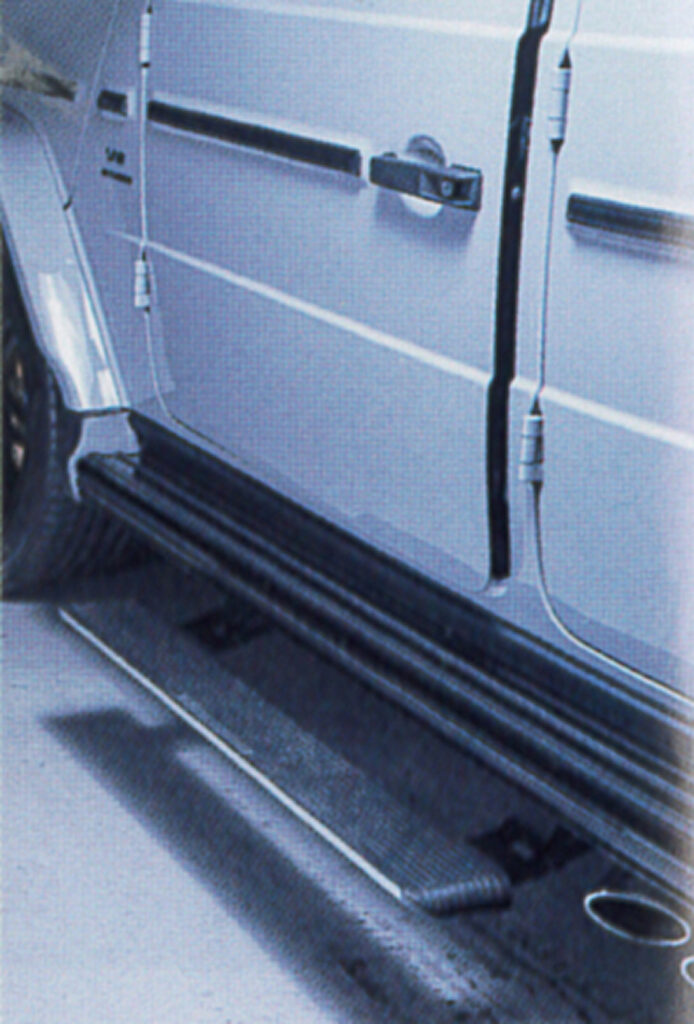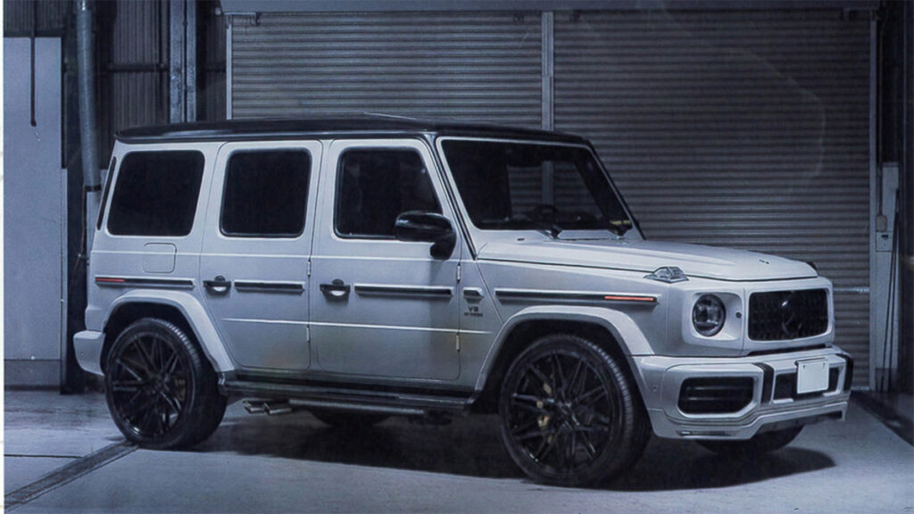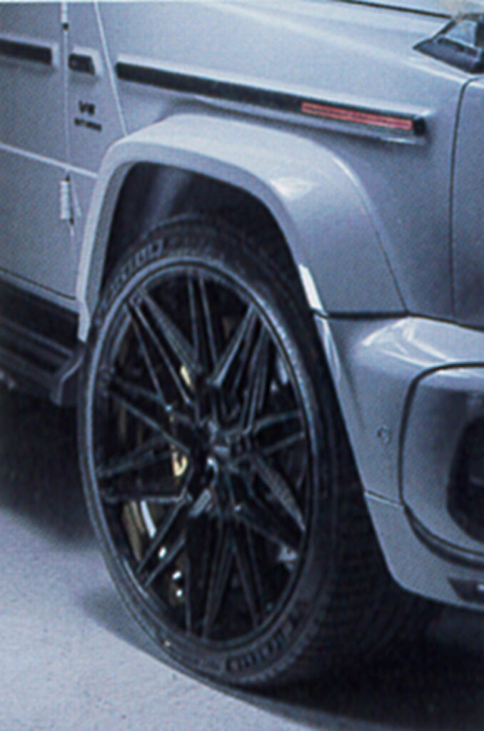 MBワークスを象徴するようなAMG G63。ユーザーへ提案する一例としてフルラッピングされ、VOSSEN(ヴォッセ)のホイールが装着される。グリルやモールのブラックアウト、電動サイドステップなどは人気メニューだ。US仕様のサイドマーカー、ステッカーとキャリパーにのみイエローを乗せたコーディネートにセンスの良さを感じる。