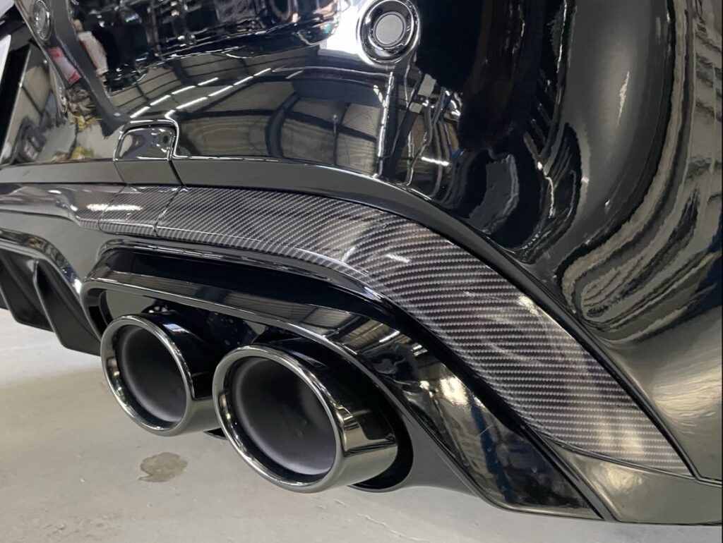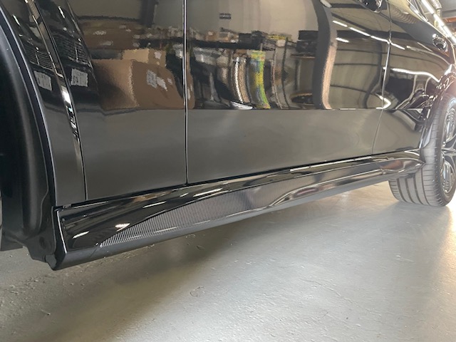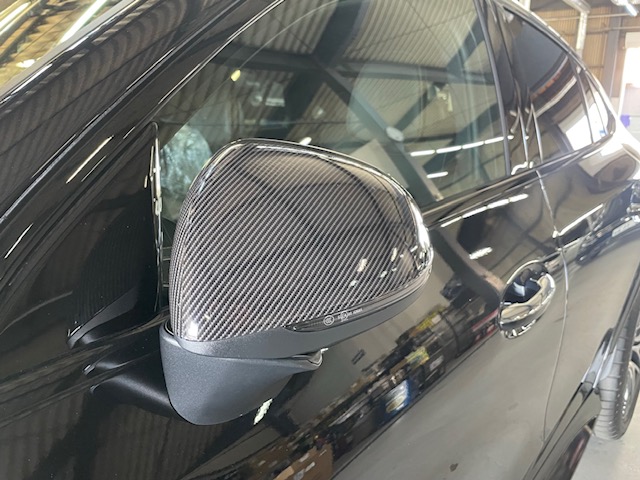 まずチープな素地パーツを目消ししてグロスブラックにペイント、そして次は全体的に真っ黒になりすぎないように、モールやドアミラーカバー、サイドステップフィン、リヤディフューザーモールなどをアクセントでグロスカーボンでラッピングを実施いたしました😘