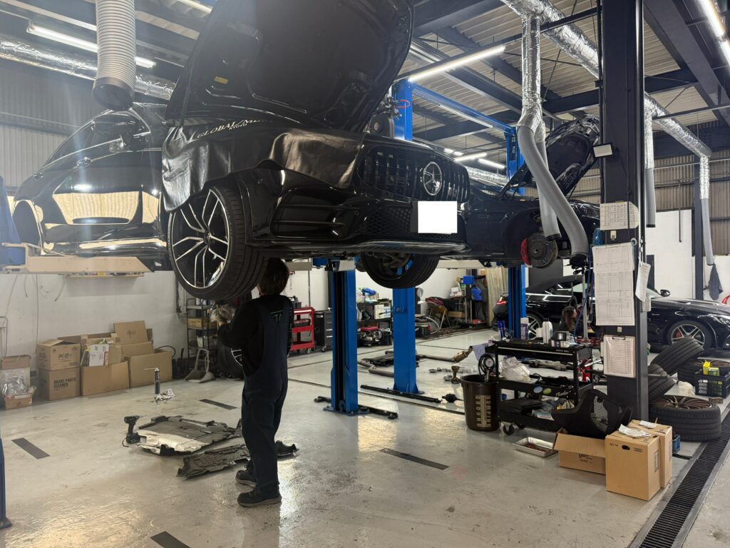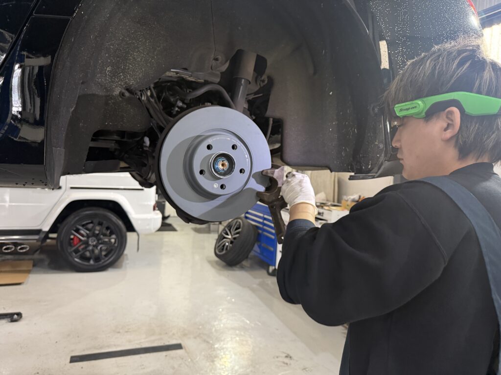 C257 CLSのリアブレーキパッド、ローターの交換中