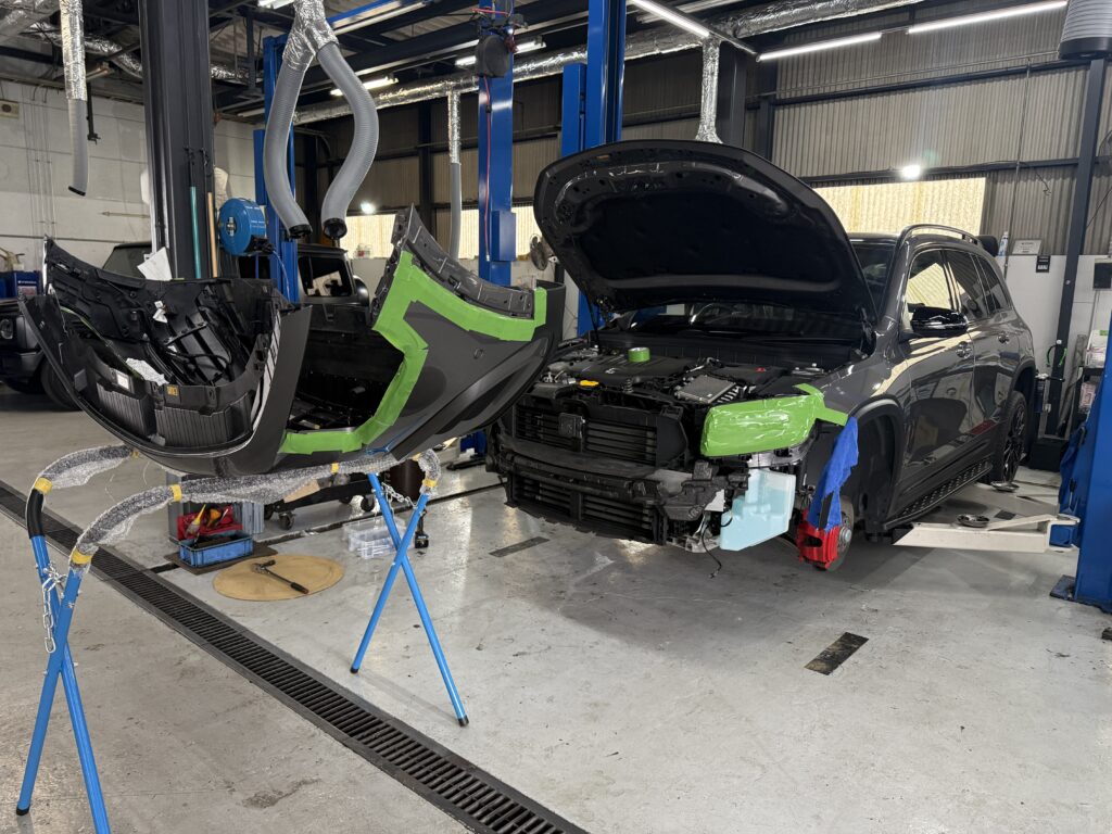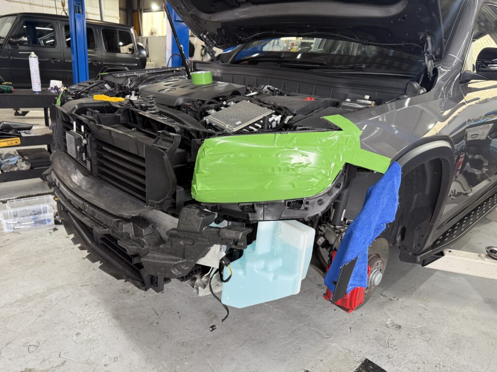 フロントバンパー脱着作業が必要となりますので、傷のチェックと付属部品をバラしていきます。