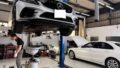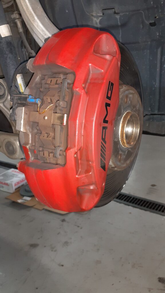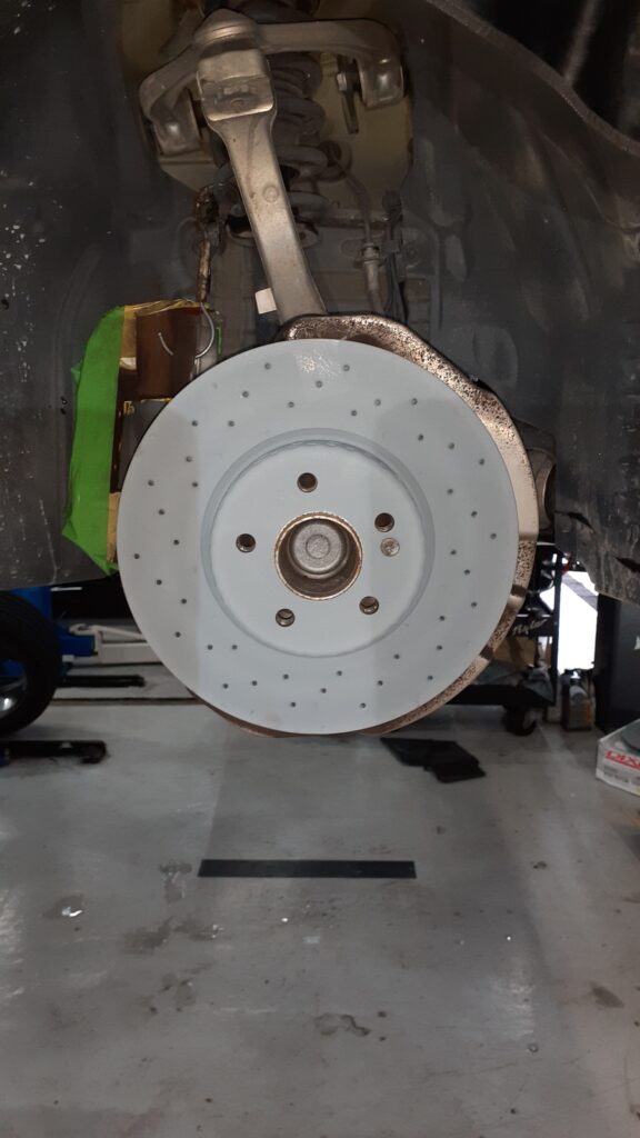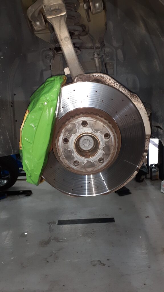 キャリパー脱着作業があるので、作業前に傷のチェックと養生。経年劣化により純正キャリパー塗装が剥がれてきている車両も多く、その場合養生して剥がす際にめくれる可能性が高いので、事前にお伝えし、養生方法を変更して作業する場合もございます。