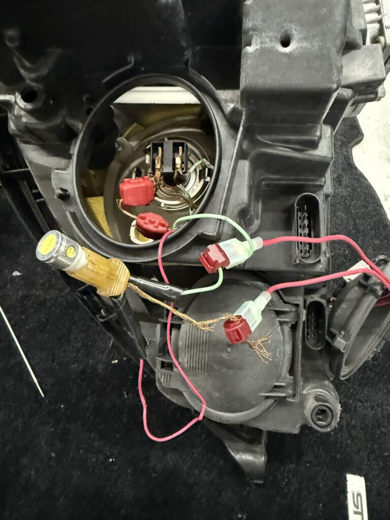配線が剥き出し。これは危ないと急遽ヘッドライトをおろして、配線修理をしていきます。劣化により被覆がめくれているところと、恐らく一昔前に加工作業された際にしっかりとされていなかったんだろうという感じでしょうか。
