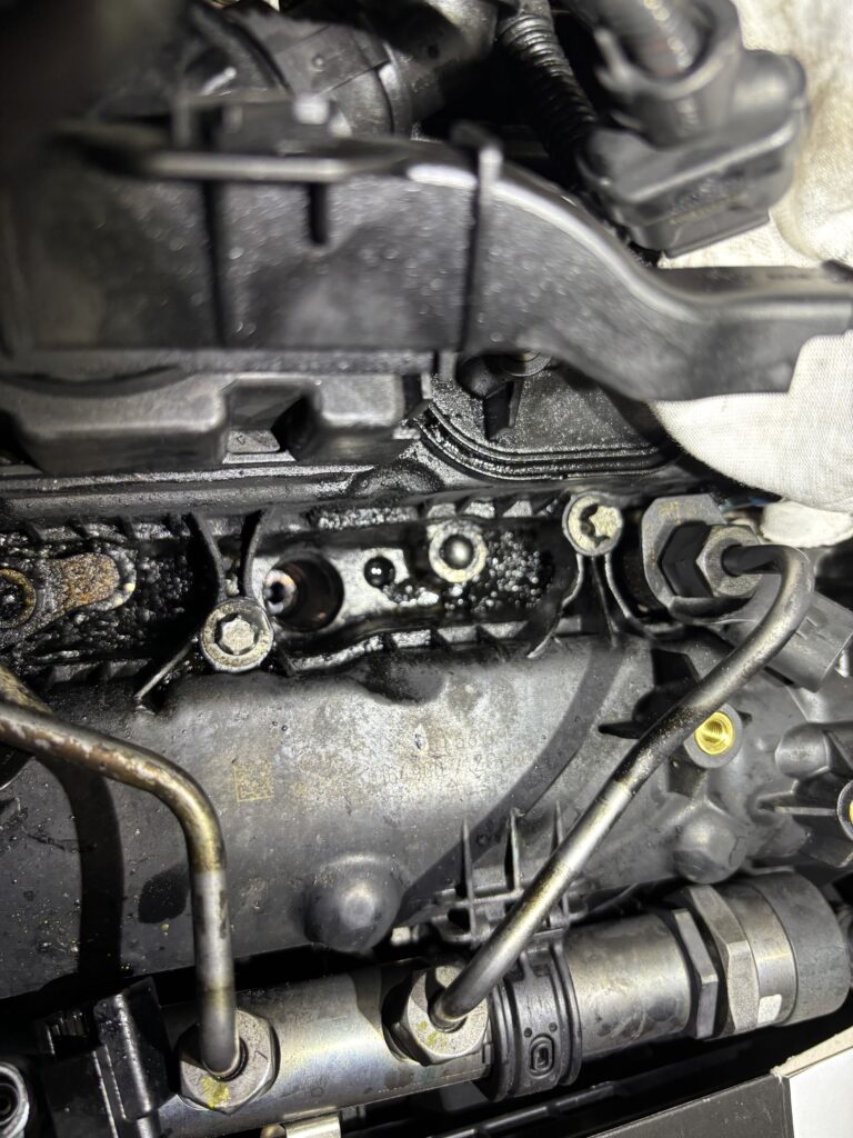 エアークリーナーの蓋や、エアマスセンサーなどを一旦避けて、見てみますと3番インジェクターあたりから排気漏れが、、、