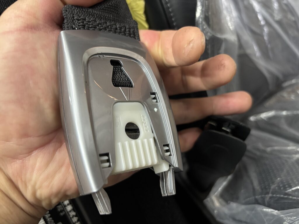 シートベルトのバックルはゴムブーツを下にスライドさせると、バックルの裏にロックが見えるのでマイナスで90°回すと外れます。